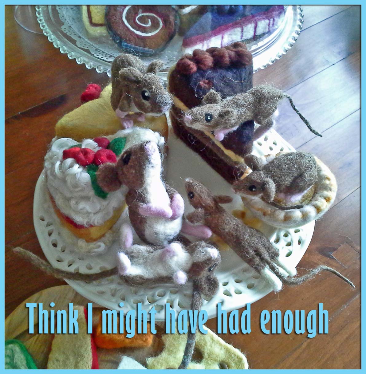 Felt Hungry 2: "Mouse Story" A 'Static Animation' telling the little-known story of a meticulously planned raid by a family of needle felted mice on a cache of needle felted cheese and needle felted cakes (for dessert) |